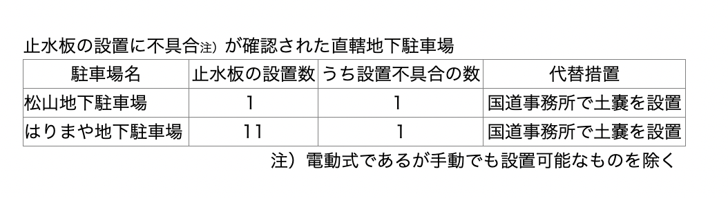 これらの直轄地下駐車場については、代替措置として、気象状況に応じて国道事務所で土嚢を設置する体制が既に構築されている。