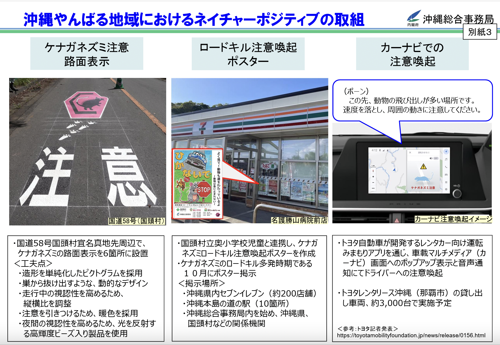 実施内容は、ケナガネズミ注意の路面表示の設置、ロードキル注意喚起ポスターの設置などとなっている。なお、ヤンバルクイナのロードキル対策については、来春開始を予定している。