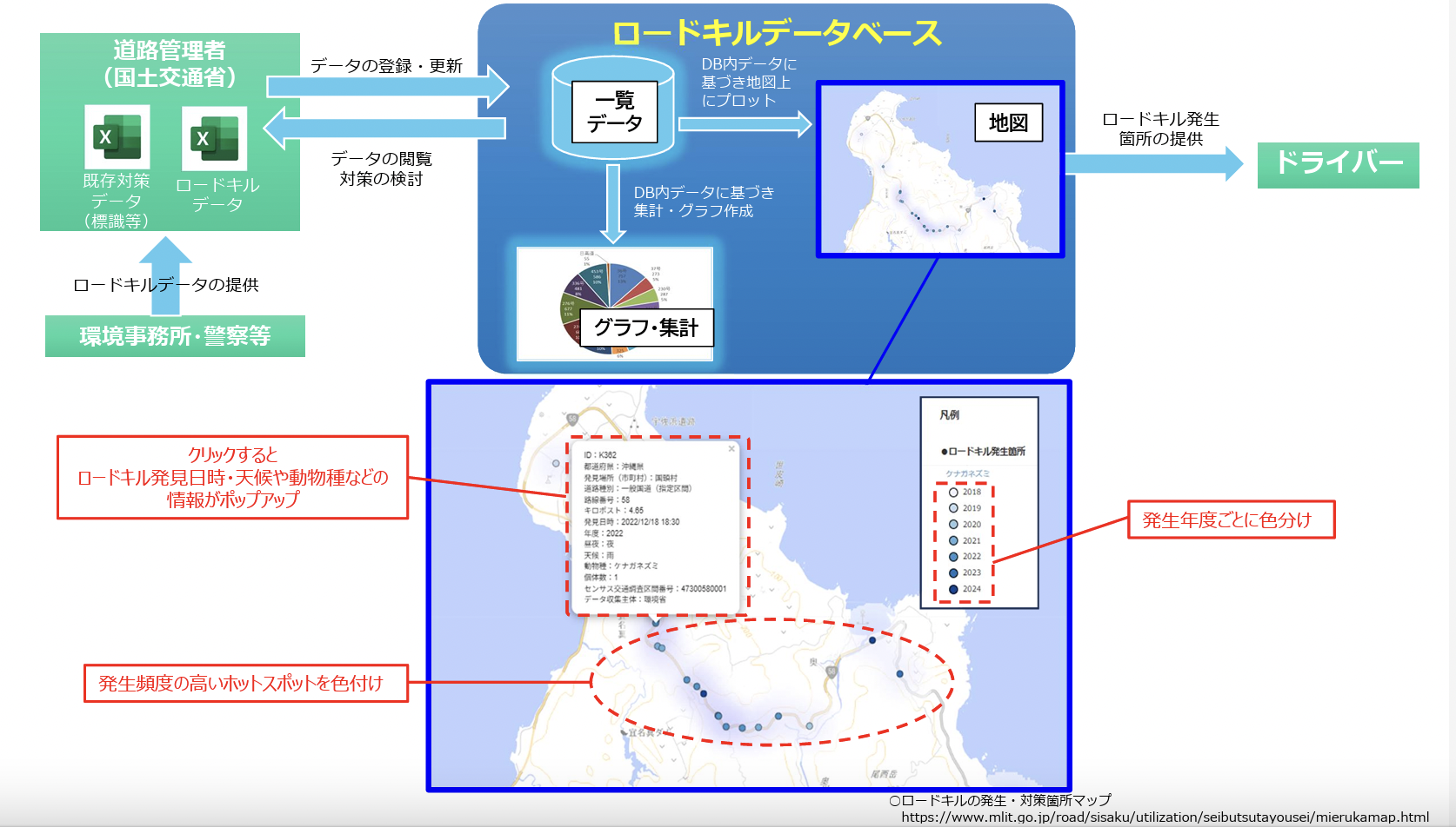 6月には、過去のロードキル発生情報を集約したデータベースを構築し、北海道はエゾシカ、沖縄はヤンバルクイナとケナガネズミを対象に事故多発区間・時期・時間帯を特定した。あわせて、「ロードキル発生箇所マップ」を道路局のホームページ上で公表した。