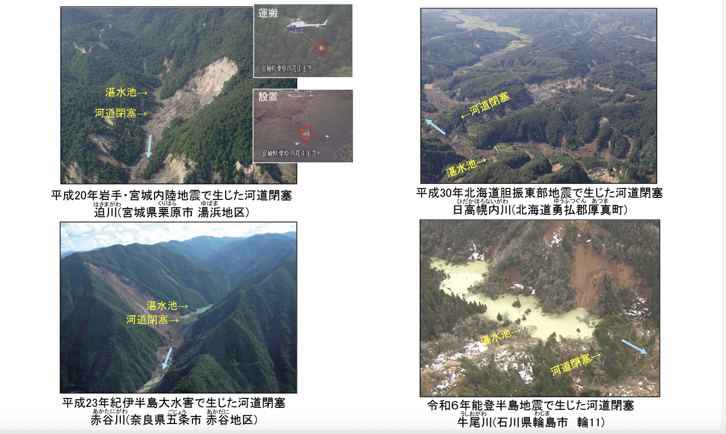 我が国では、これまでに地震や豪雨により幾度も河道閉塞が形成され、国土交通省でも緊急に対策を行ってきた。