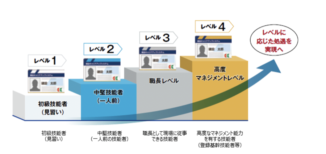 国土交通大臣から基準認定を受けた分野においては、各団体によって同基準に基づき技能者の経験、知識・技能、マネジメント能力に応じて4段階で技能レベルの判定が行われる。