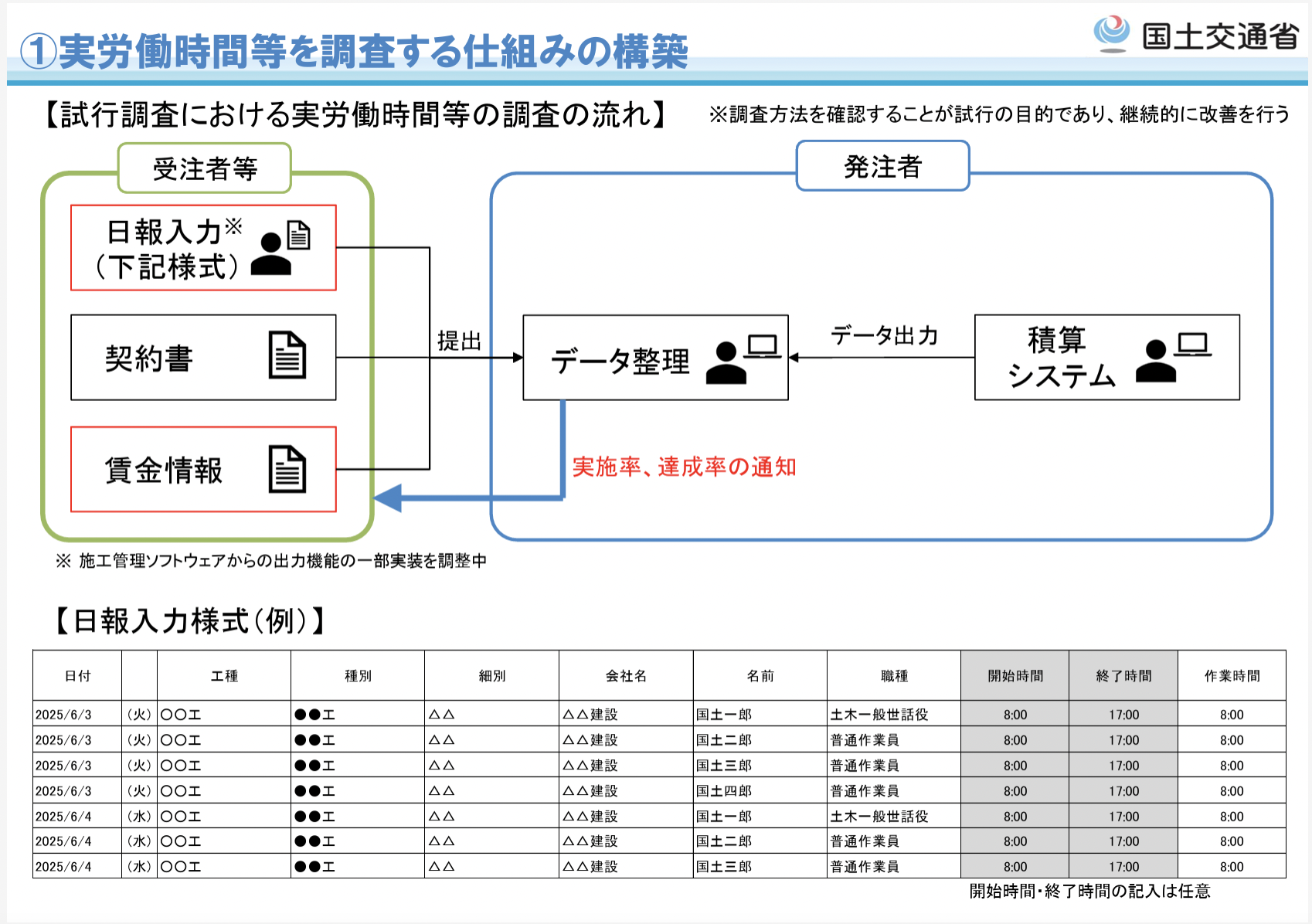 国土交通省は、直轄土木工事にて受注者の協力の下、技能労働者への賃金の支払いや労働時間等の実態を調査する試行を受注者の希望に基づき実施する。