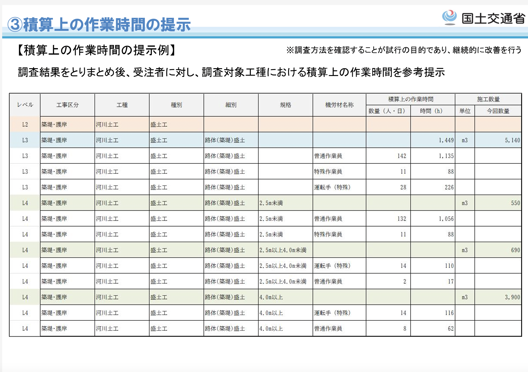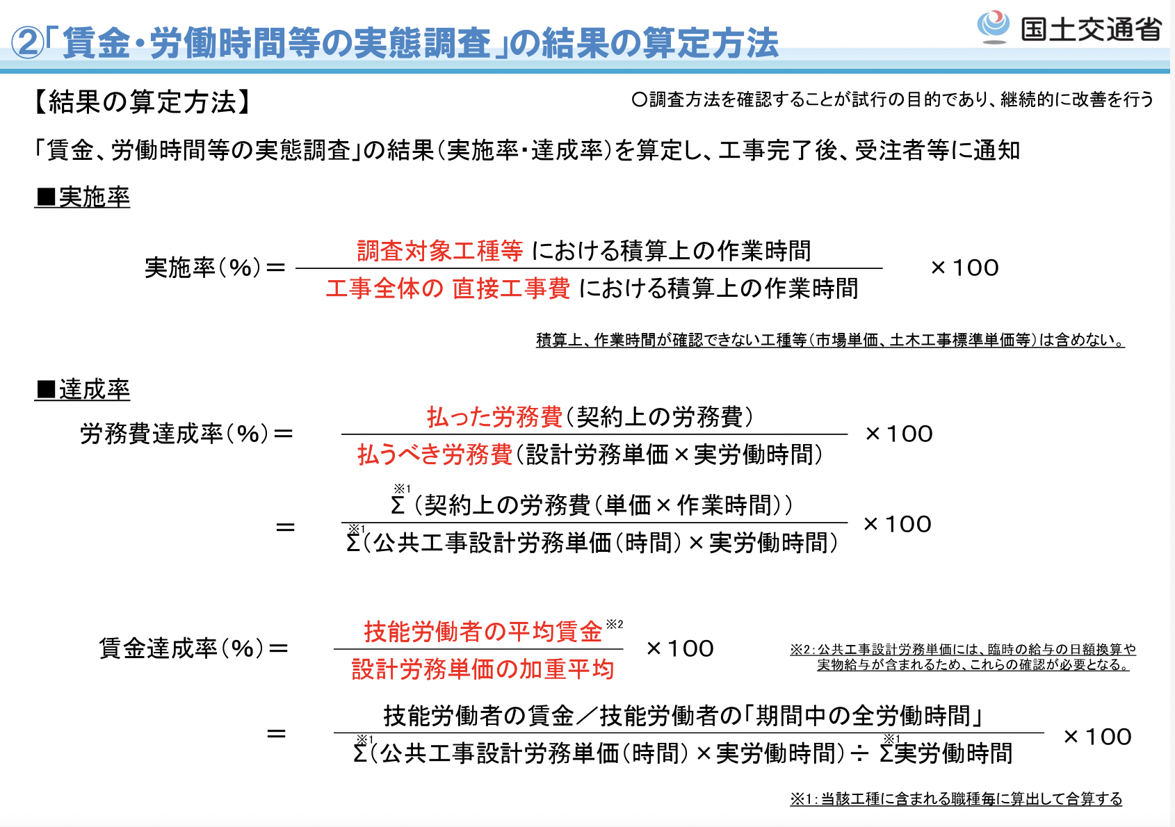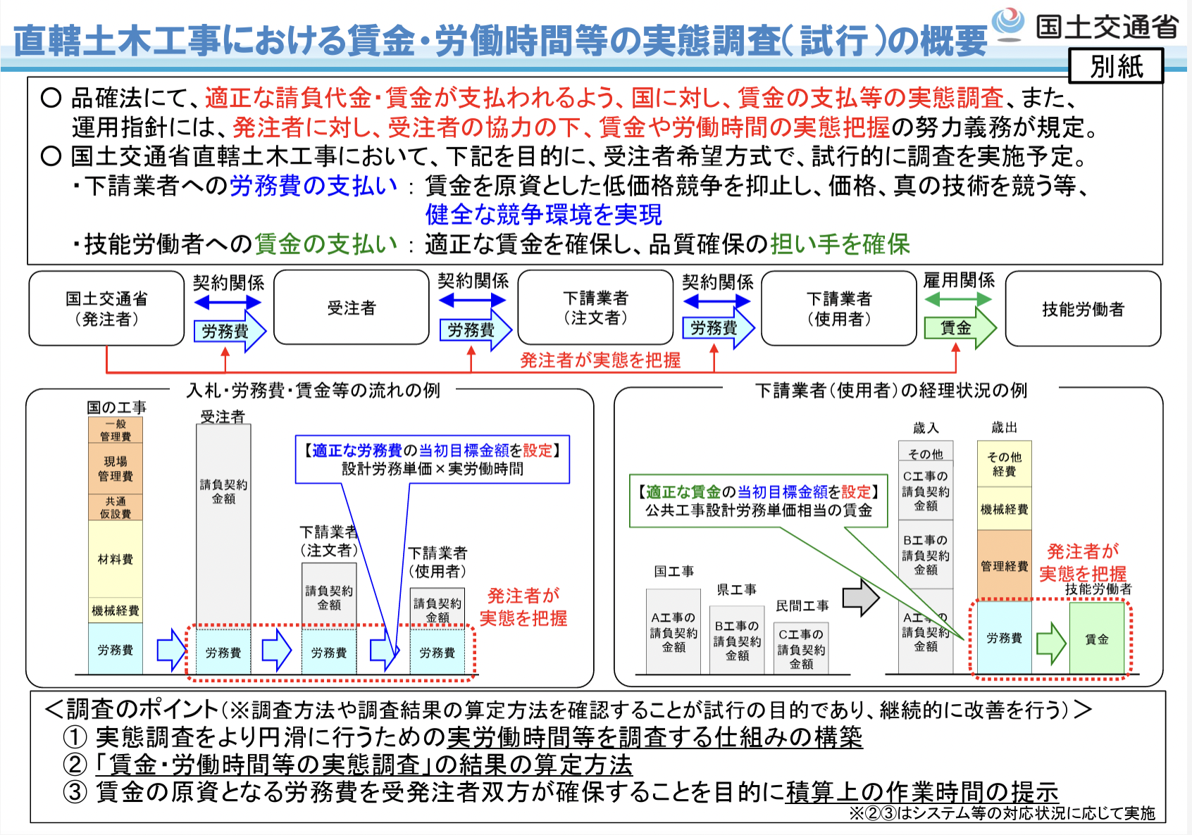 これを踏まえ、国土交通省直轄土木工事にて、受注者の協力の下、技能労働者への賃金の支払いや労働時間等の実態を調査する試行を受注者の希望に基づき実施する。