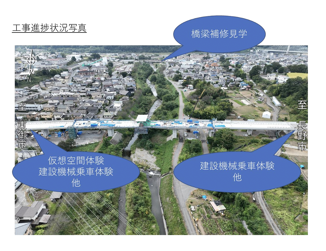 現場見学会では、橋梁架設工事・道路改良工事・橋梁補修工事の現場見学を行う。建設機械への乗車体験やVRグラスを用いた仮想空間での橋梁上部工体験、ドローンを用いた記念撮影、ひび割れ補修体験などを予定している。