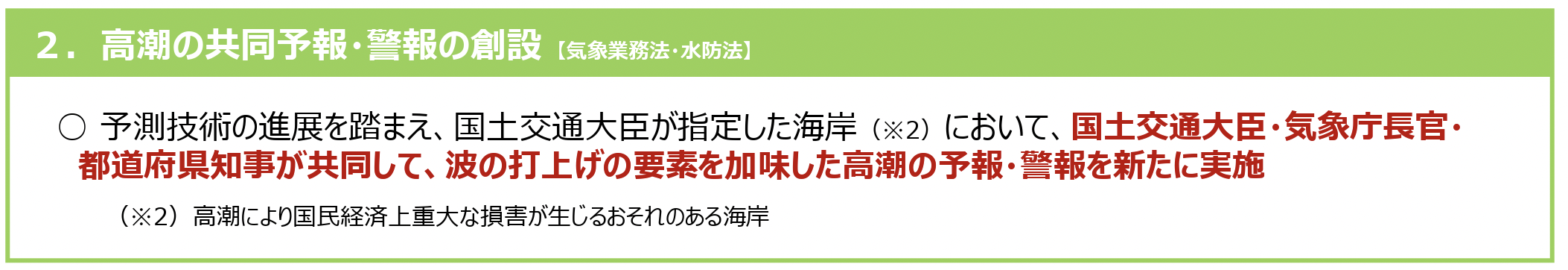 また、高潮の共同予報・警報の創設により、沿岸部の建設現場においても、より精度の高い防災情報に基づいた対応が可能になる。