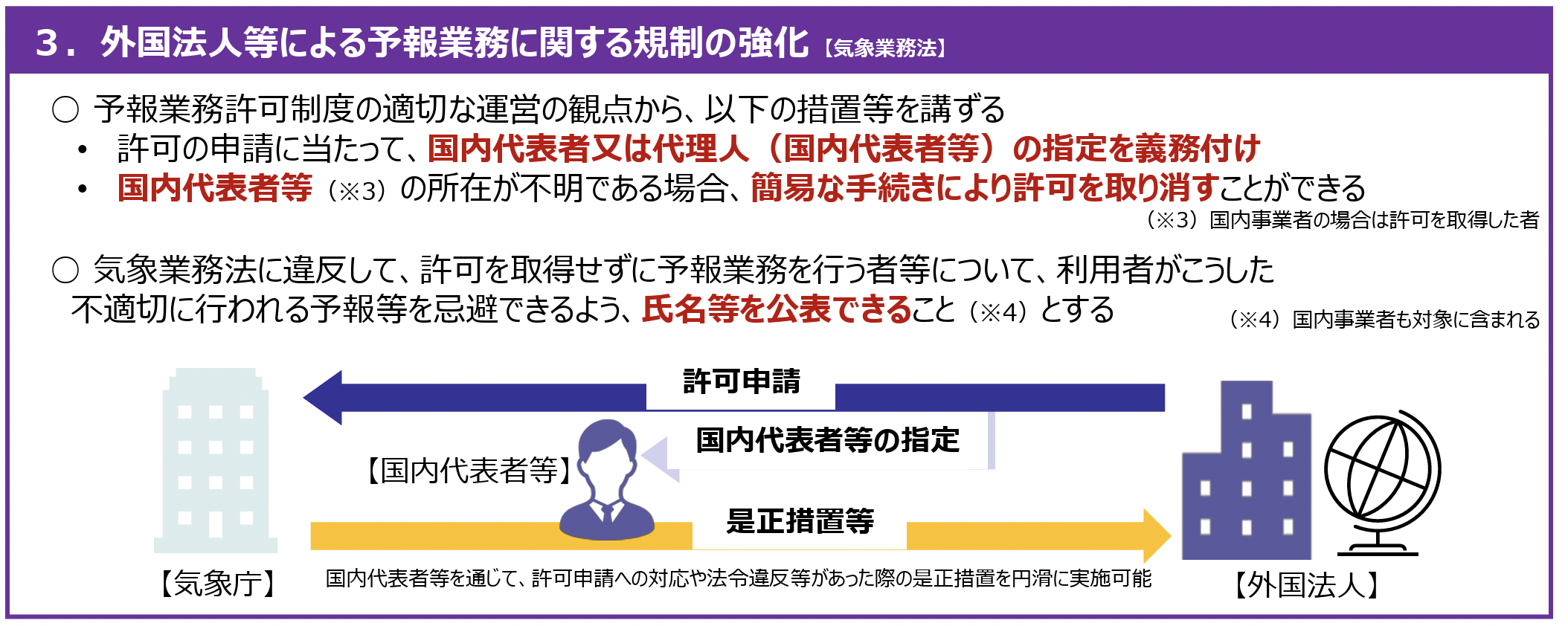 外国法人等による予報業務に関する規制の強化も盛り込まれた。情報通信技術の進展等により、日本国内に向けて不適切な気象等の予報業務を行う外国法人等が現れていることから、規制を強化する必要がある。