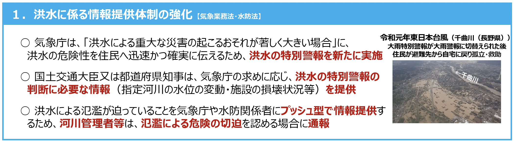 法律案の洪水に係る情報提供体制の強化では、気象庁は、洪水による重大な災害の起こるおそれが著しく大きい場合に、洪水の危険性を住民へ迅速かつ確実に伝えるため、洪水の特別警報を新たに実施する。