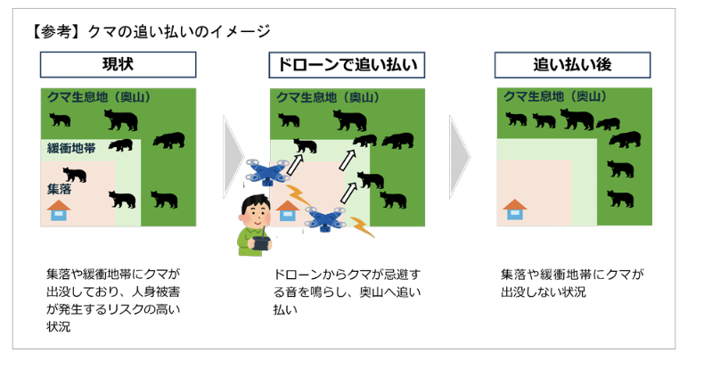 具体的には人の生活圏から山に向かってドローンを飛ばし、クマが嫌がる犬の鳴き声や爆竹の音をスピーカーから出す。