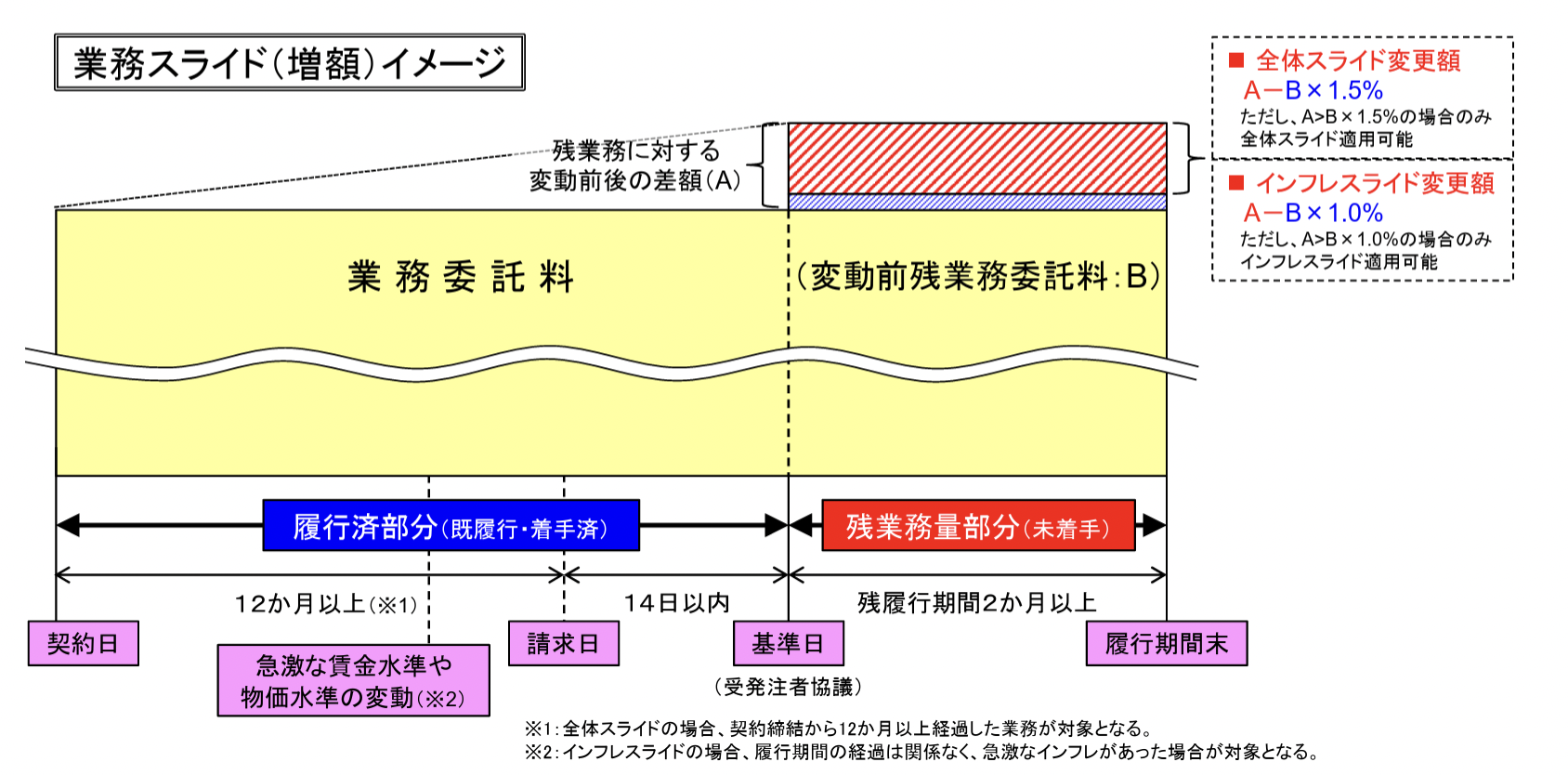 今回導入される「業務スライド」は、工事請負契約ですでに運用されているスライド条項(全体スライド、インフレスライド)を業務委託にも適用するものだ。