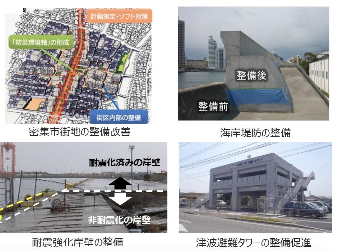 また、「命を守る」対策として、海岸堤防や住宅・建築物の耐震化、津波避難タワーの整備といったハード面の強靭化も引き続き推進される。