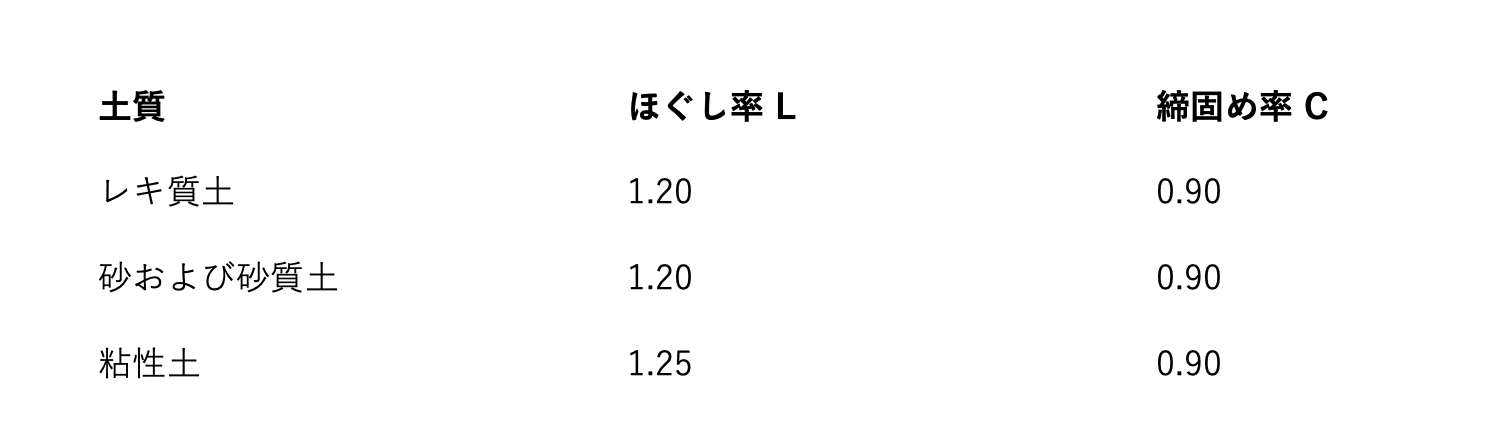 また、国土交通省の「土木工事積算基準」では、土質ごとの一般的な土量変化率を次のように定めている。
