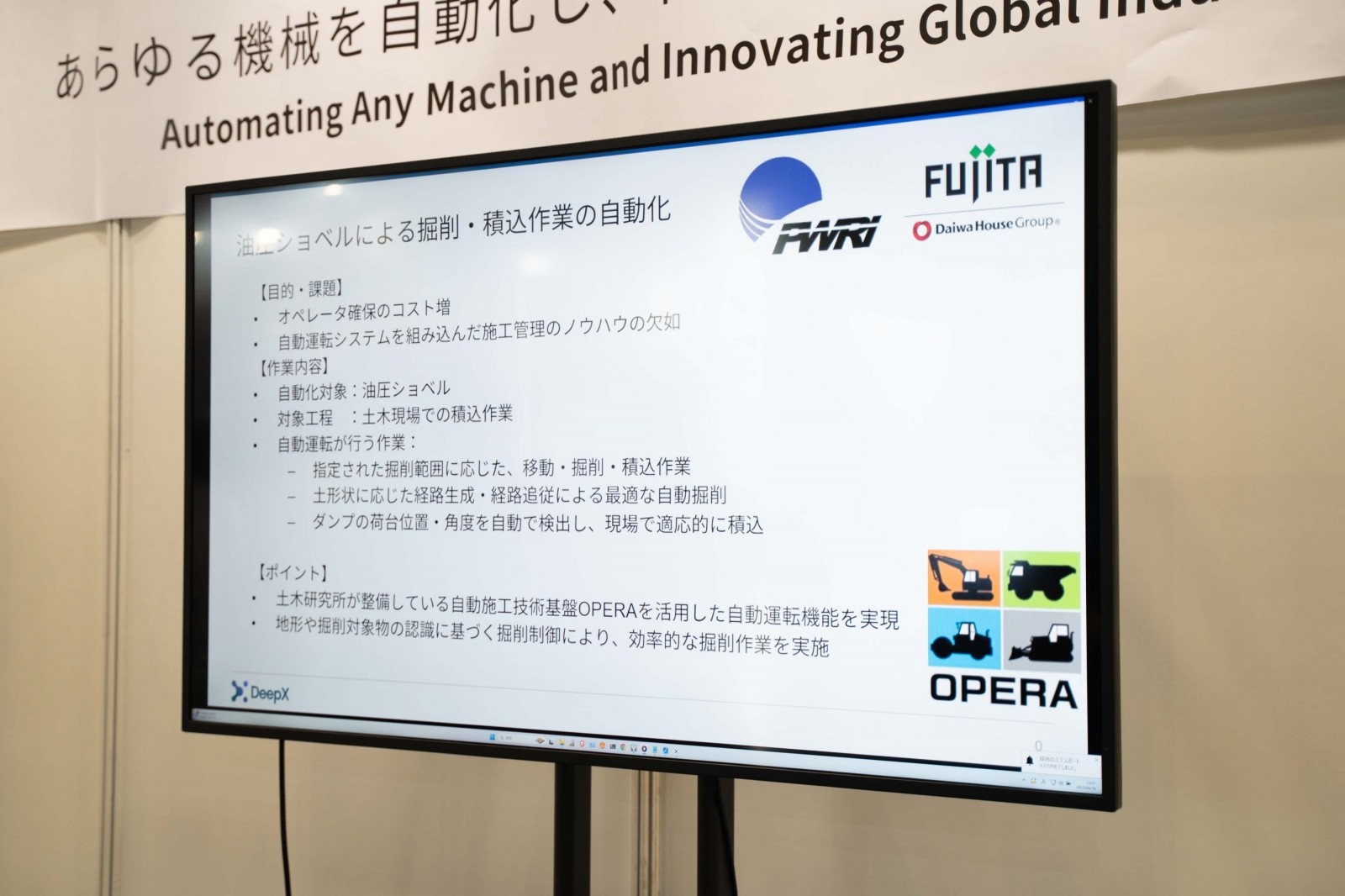 DeepXは、東京大学松尾研究室発のAIスタートアップとして、「あらゆる機械を自動化し、世界の生産現場を革新する」というミッションのもと、建設機械の自動運転技術とリアルタイムデジタルツインシステムを展示した。