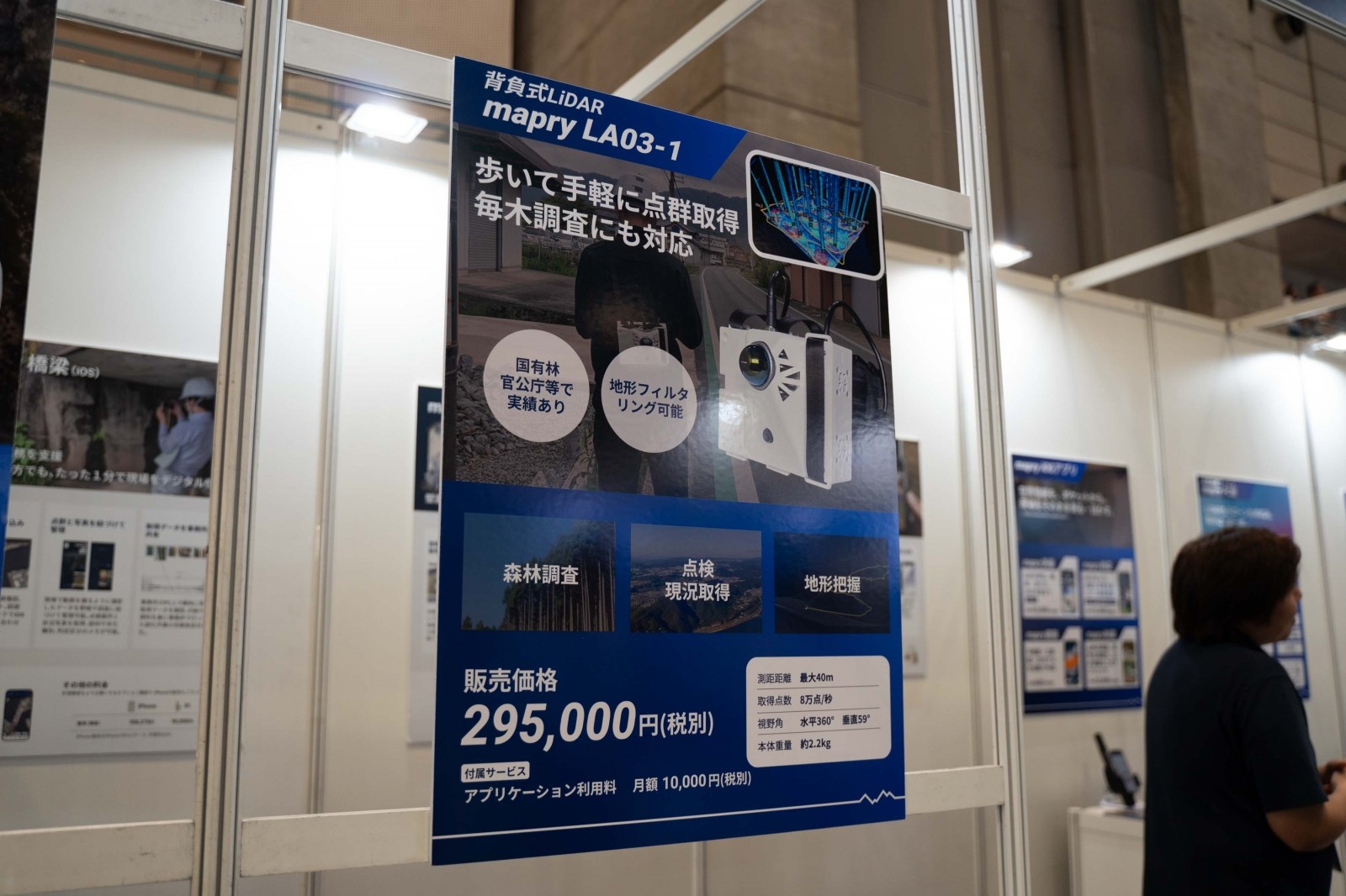 Mapryは、森林調査のデジタル化を推進する次世代計測システム「LA03」を展示し、従来の標準値調査に代わる革新的なソリューションを提案した。