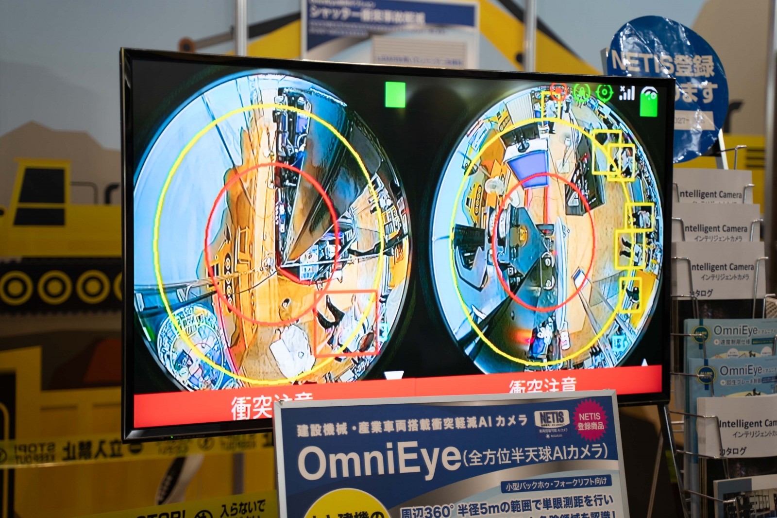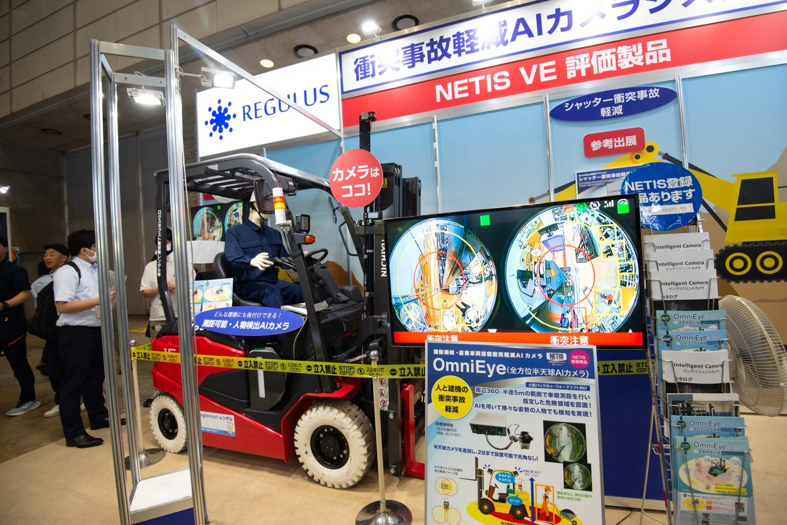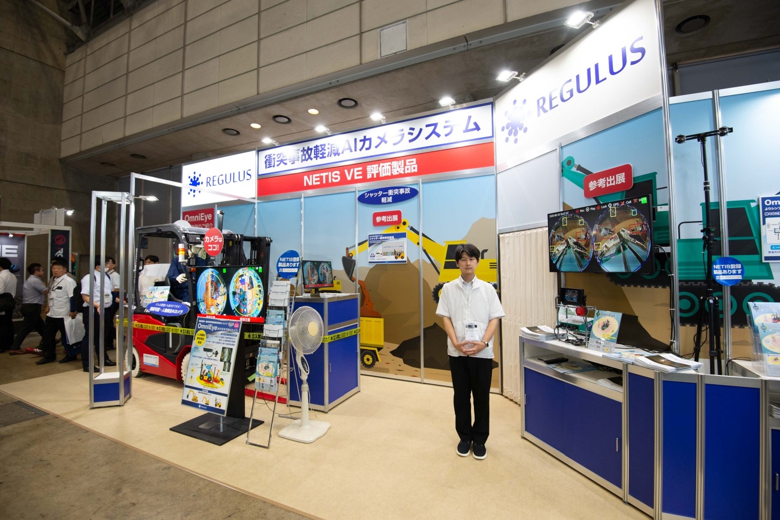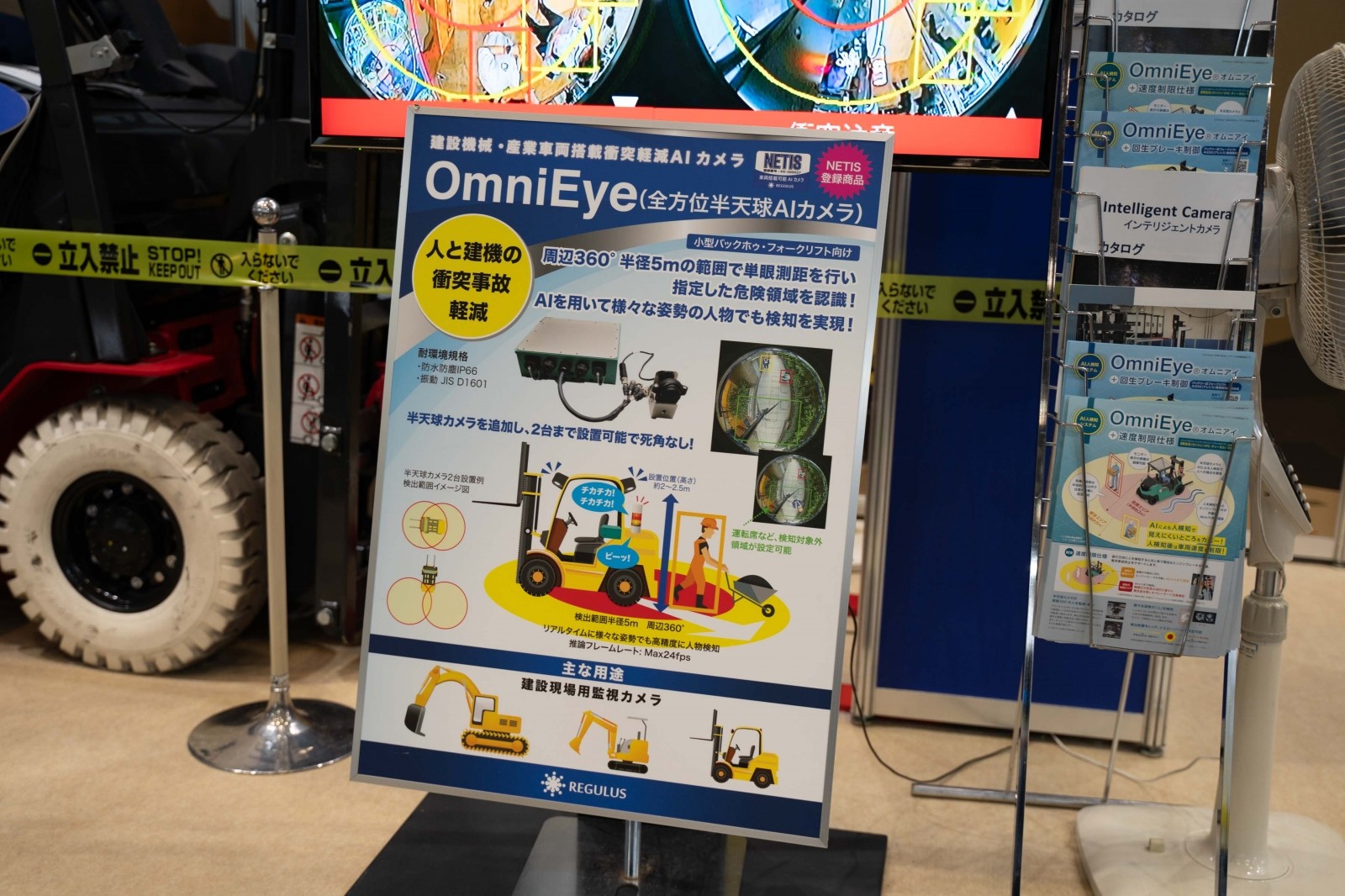 レグラスは、建設現場での重篤な労災事故防止を目指す「衝突事故軽減 人物検知AIカメラ OmniEye/EagleEyeII」を展示し、建機と人との衝突事故軽減ソリューションを提案した。