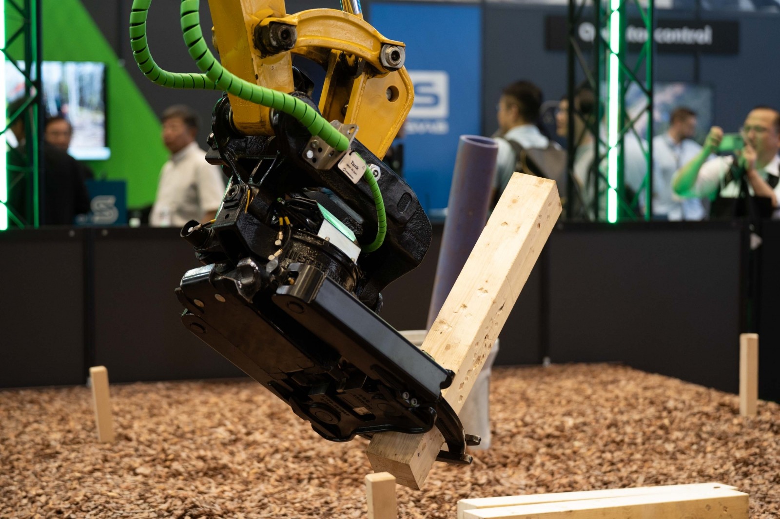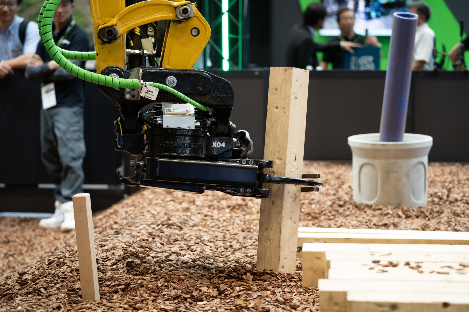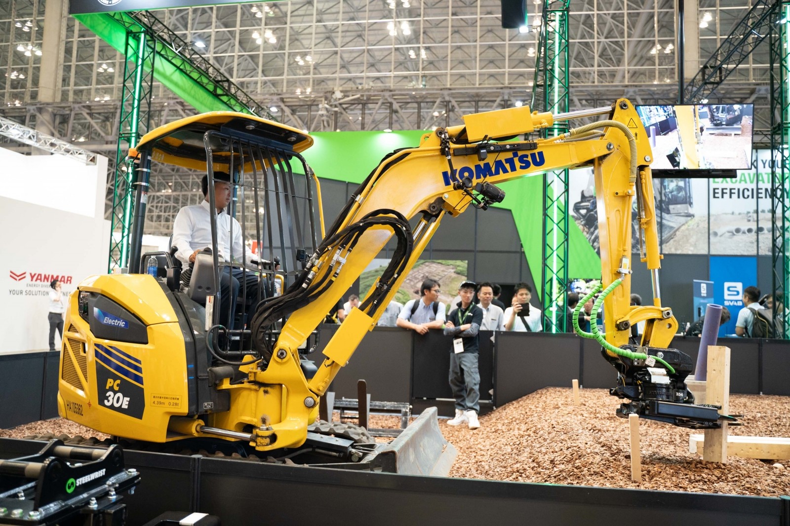 実演では、スチールリストのX04直付けチルトローテータを搭載したVolvo ECR25電動ショベルとコマツPC30E電動ショベルの2台を使用し、ワークツール共用の効率性を披露した。