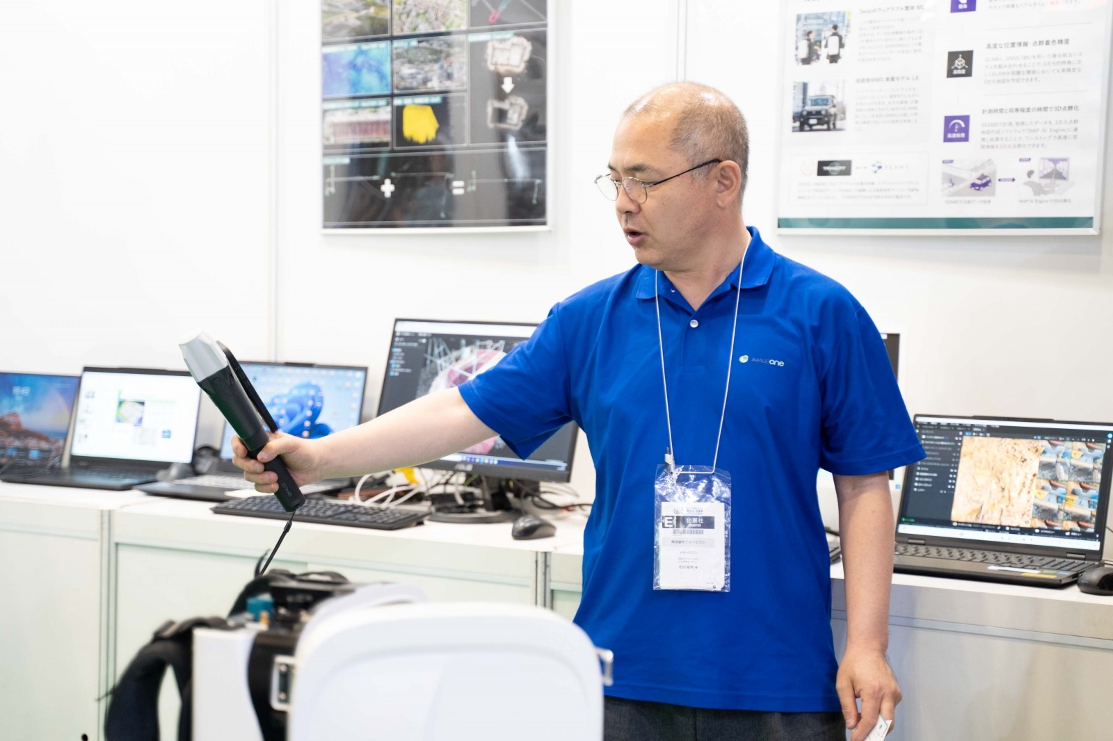 イメージワンは、写真測量技術とRTK測位を組み合わせたスマートフォン対応の高精度3D測量ソリューション「PIX4Dcatch RTK」を中核に、次世代測量技術の包括的プラットフォームを展示した。