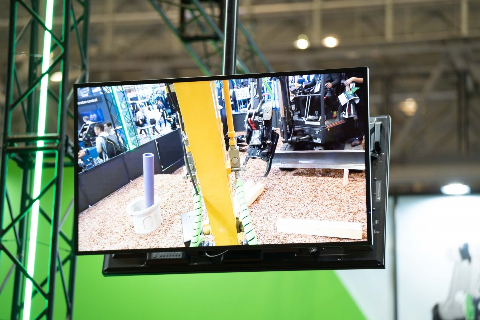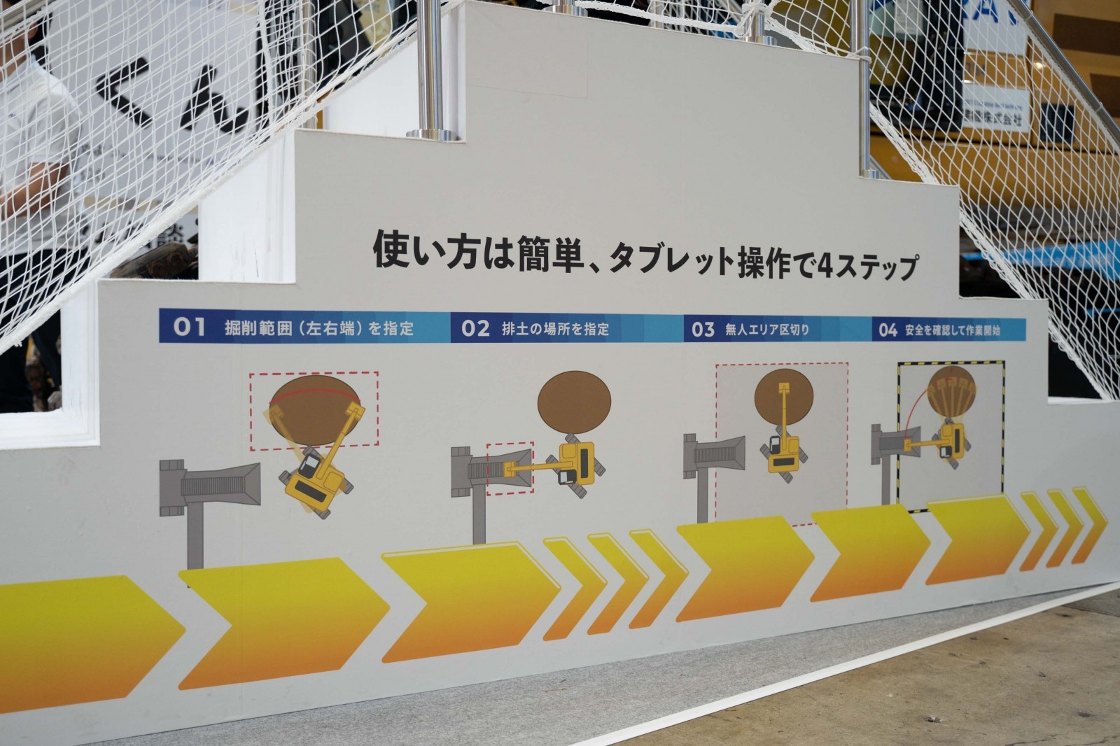 続いて建機遠隔操作システム「Smart Construction Teleoperation」による段切り作業と盛り土作業を、千葉県の試験場から展示会場へリアルタイム中継する形式で実施した。
