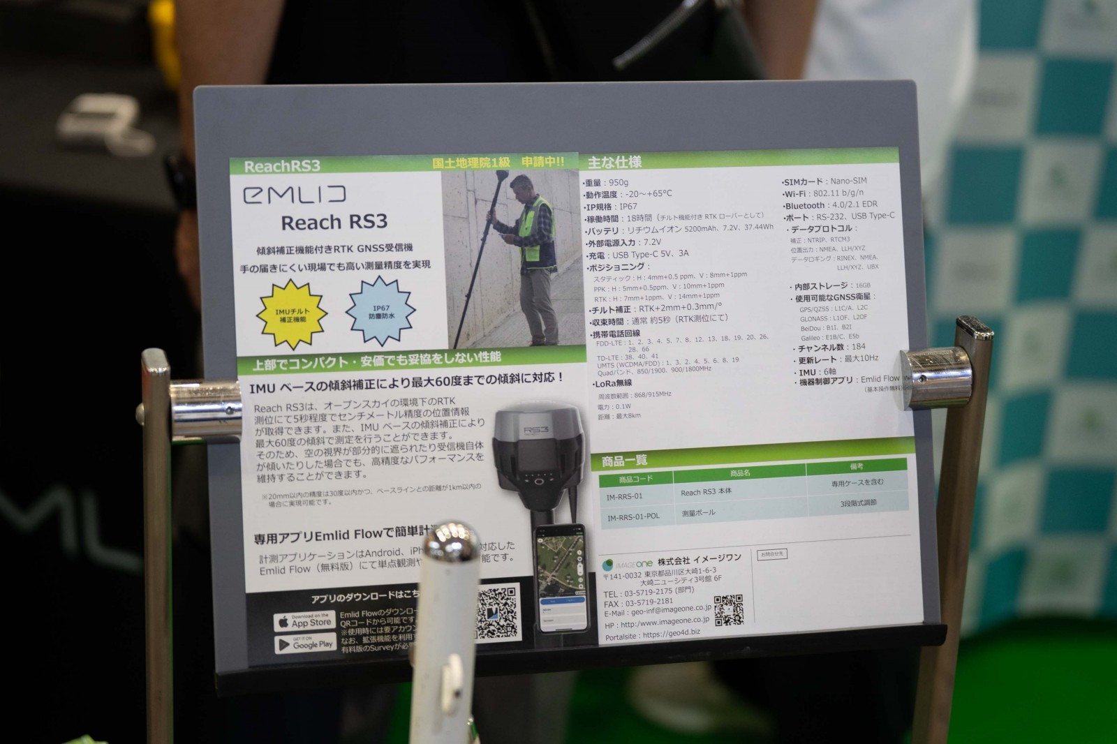 測位システムでは「Reach RS3」を展示し、高精度な単点測位とRTK測位に対応したGNSS受信機として、IMU搭載により最大60°の傾斜でも20mm以内の精度を維持することが可能だ。