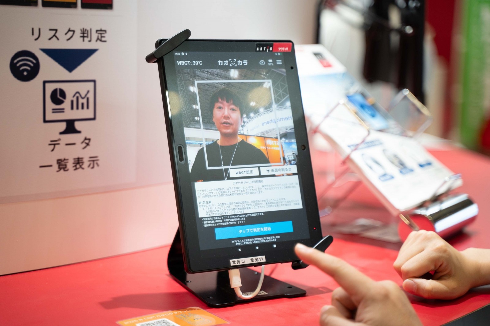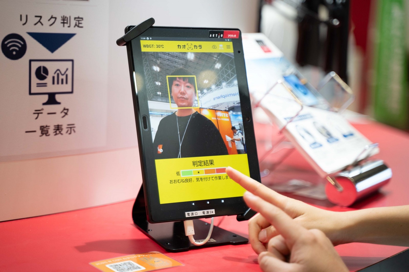 作業員の顔を撮影するだけで、気温や湿度などの外部環境要因と、個人の体調や疲労度などの生体情報を総合的に解析し、熱中症や体調不良のリスクを事前に検知するシステムとなっている。