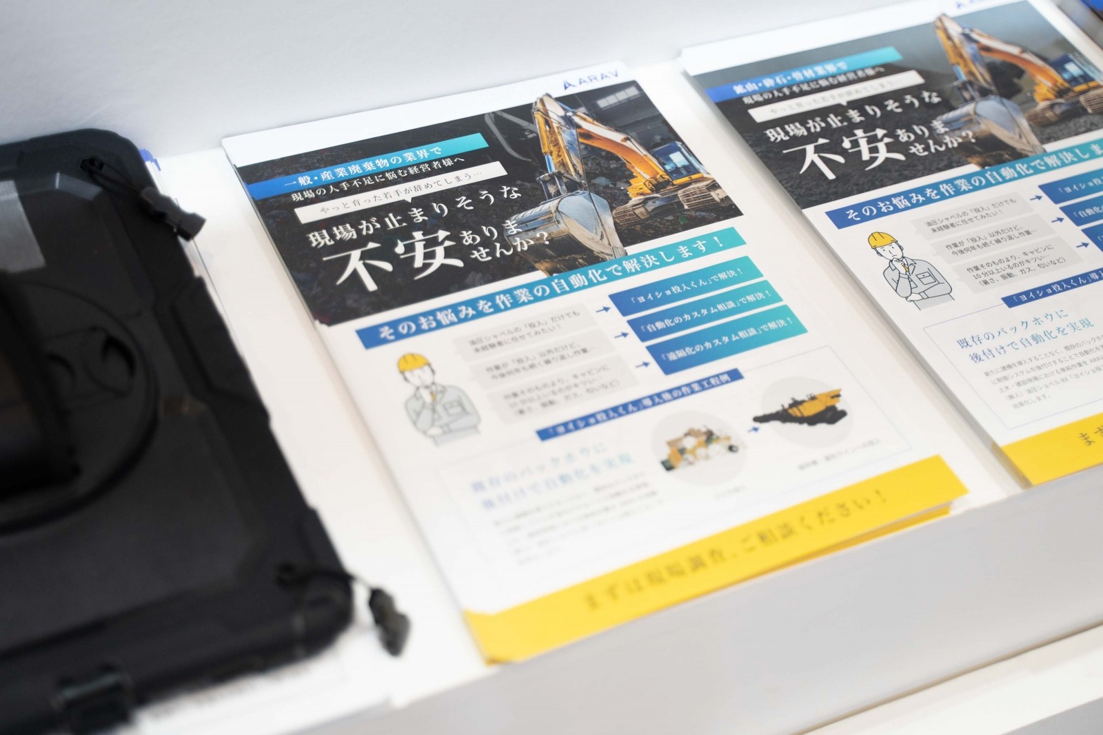 ARAVは、自動油圧ショベルRX「ヨイショ投入くん」のデモ展示を開始し、電子制御式油圧ショベルへの後付けによる無人稼働実現を提案した。
