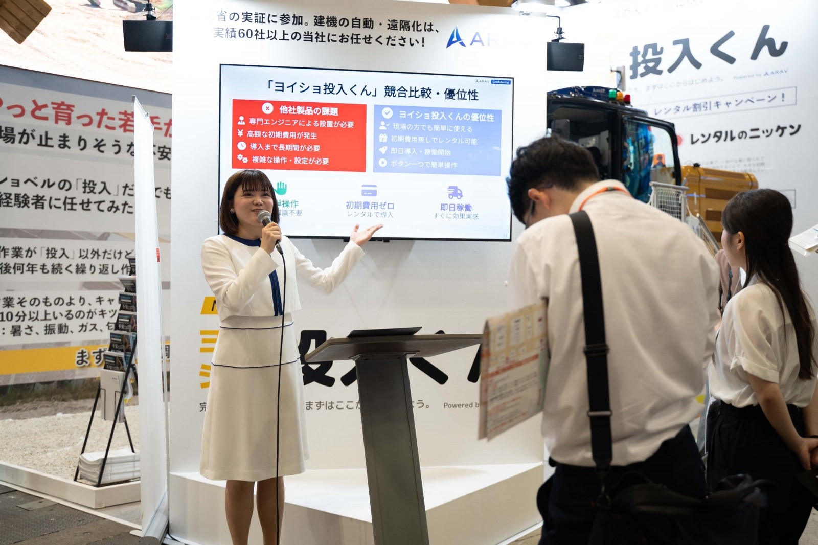 衛星通信サービス「Starlink Business」やサイレントシステム商材、リチウムイオン電池式電動バックホー「TB20e」などと共に、現場の課題解決を目指す実用性の高いソリューションとして多くの来場者から高い評価を得た。