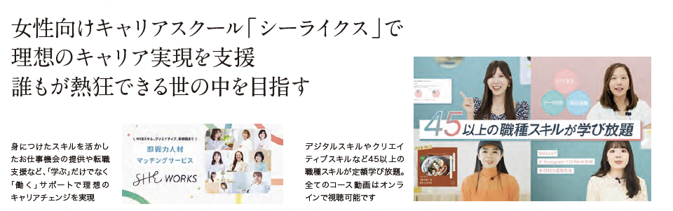 女性向けキャリアスクール「SHElikes」を主要事業として展開し、WEBデザインやWEBマーケティングなどのデジタルスキルやクリエイティブスキルのレッスン、コーチングプログラム、仕事機会を提供している。