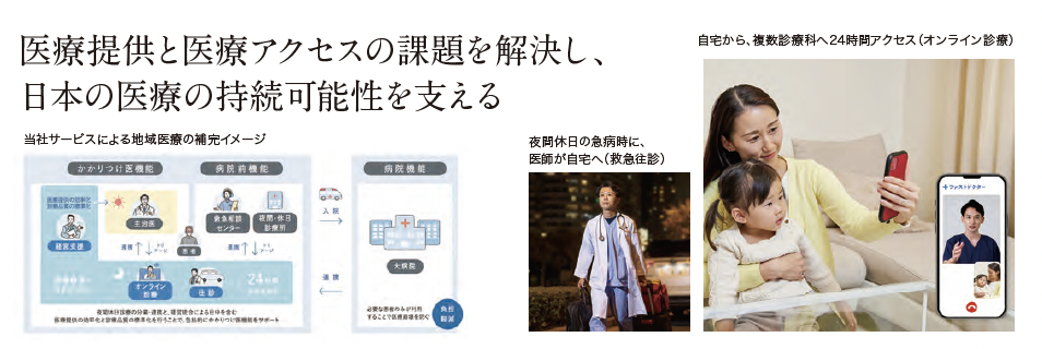 日本の「2040年問題」として予想される医療需給バランスの崩壊に対し、医療リソースを集約した独自のプラットフォームを通じて一次医療を補完し、医療の機能分化を支え、地域医療の持続可能性を実現することに挑戦している。