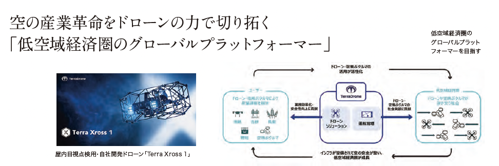 国土交通大臣賞を受賞したTerra Droneは、「Unlock X Dimensions ~異なる次元を融合し、豊かな未来を創造する~」というミッションのもと、ドローンや空飛ぶクルマが飛び交う社会の実現を目指している。