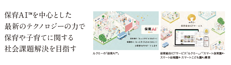 こうした課題に対して、保育総合ICTサービス「ルクミー」を通じて、保育AI™など最新のテクノロジーの活用を進めながら、保育者の時間と心のゆとりを創出し、子ども達との豊かな関わりや対話を増やし、保育者のやりがいの創出、エンゲージメントの向上を目指している。