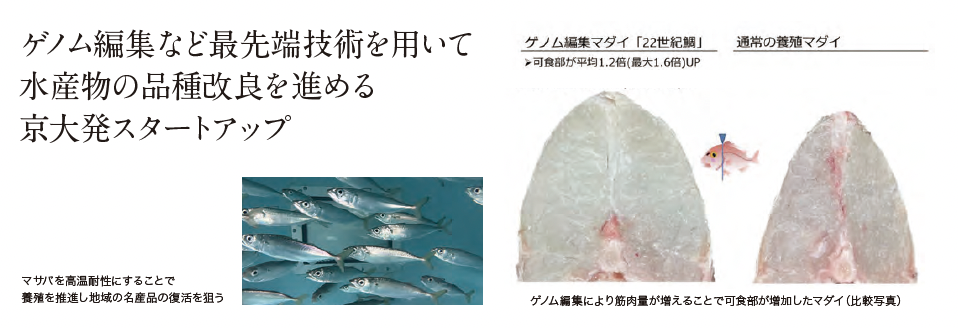 例えば、可食部が大きく成長速度が速いなど生産効率の高い魚、高温耐性となり地球温暖化が進んでも養殖できる魚の品種改良に成功している。