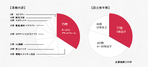 応募企業の業種内訳では、サービス・プラットフォーム分野が79件と最も多く、次いでIoTデバイス・ICT・アプリが32件、医工・バイオが29件と続いた。