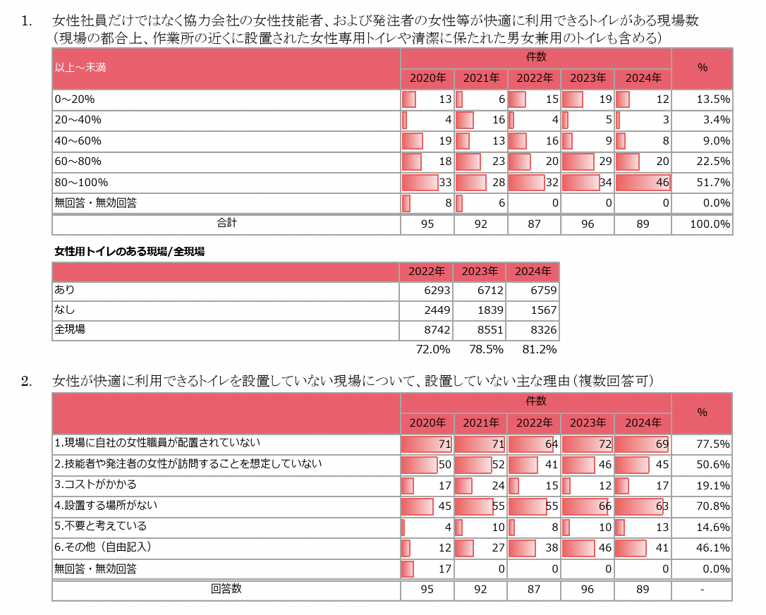 女性用トイレの設置状況では、2024年に6759現場で設置され、全8326現場のうち81.2%をカバーしている。