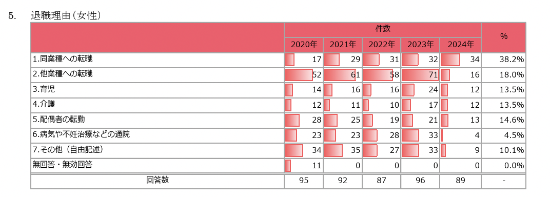 他業種への転職が18.0%、育児が13.5%、介護が13.5%、配偶者の転勤が14.6%となっている。