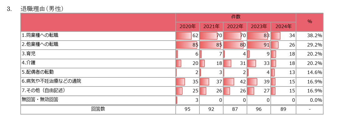 雇用期間満了や定年退職、待遇・評価への不満、労働時間への不満といった雇用形態・待遇・職場環境に関する理由も見られる。