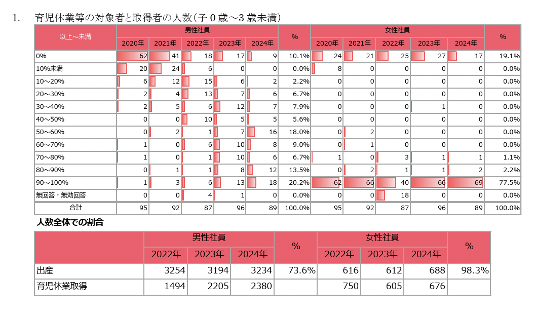 0歳から3歳未満の子を持つ男性社員の育児休業取得率は73.6%に達し、2380人が取得している。