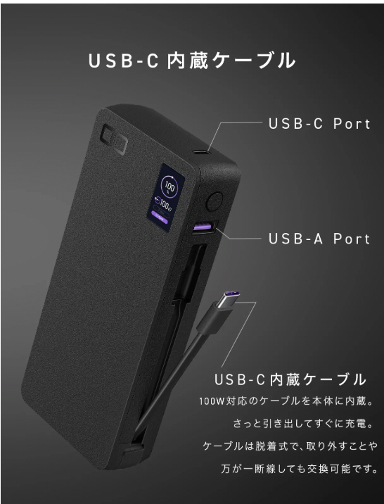 - 内蔵ケーブルとUSB-Cポートが最大65W出力