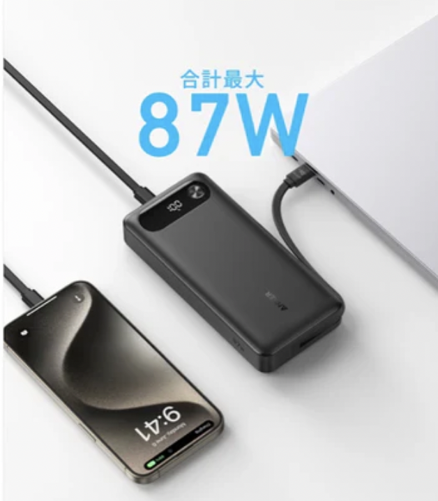 - PowerBank (20,000mAh 87W ビルトインUSB-Cケーブル) / Anker【長時間作業・複数デバイス向け / 大容量】