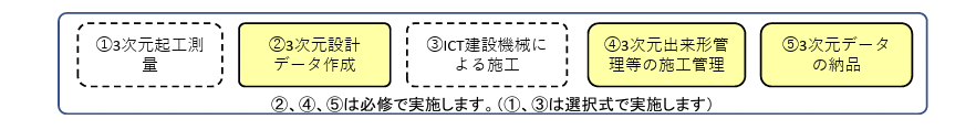 簡易型では建設プロセスの中で、膨大なコストがかかる「①3次元起工測量」と「③ICT建設機械による施工」はICTでやらなくてもよいとされている。
