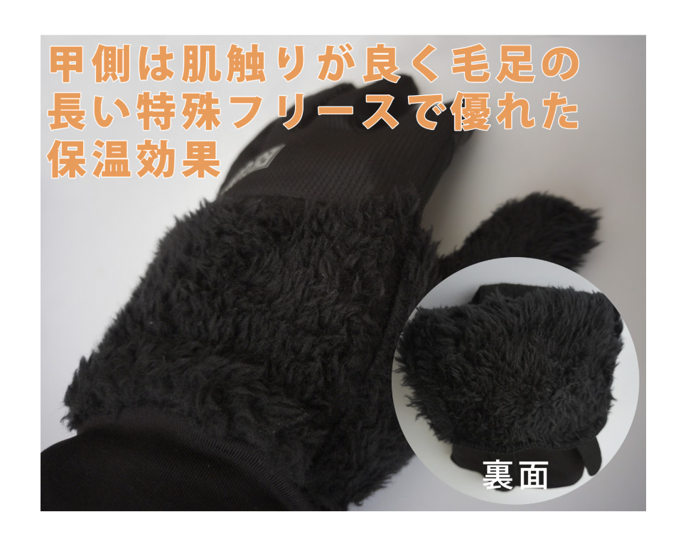 ユニチカ"サーモトロン"フリースで蓄熱保温:手袋の内装には、ユニチカが開発した蓄熱保温素材「サーモトロン」のフリース(ポリエステル100%)を使用している。この素材が体温を蓄えて保温するため、寒い日でも手を暖かく保ってくれる。