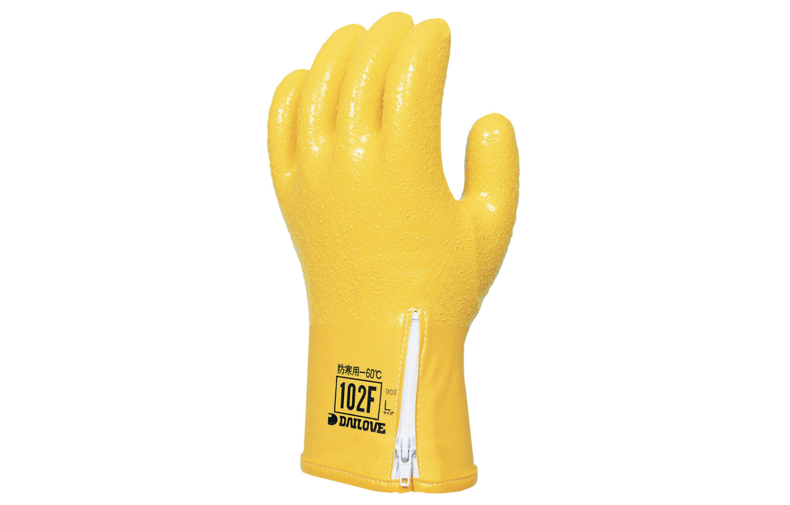 驚異の-60℃対応:本モデルの最大の特徴は、-60℃の寒さでも硬くならない特殊なポリウレタンを使用している点だ。一般的な手袋は極寒で硬くなって動かしにくくなるが、ダイローブ102Fは柔軟性を保ち続ける。環境試験や冷凍倉庫作業など、極めて厳しい低温環境でも使用できる。