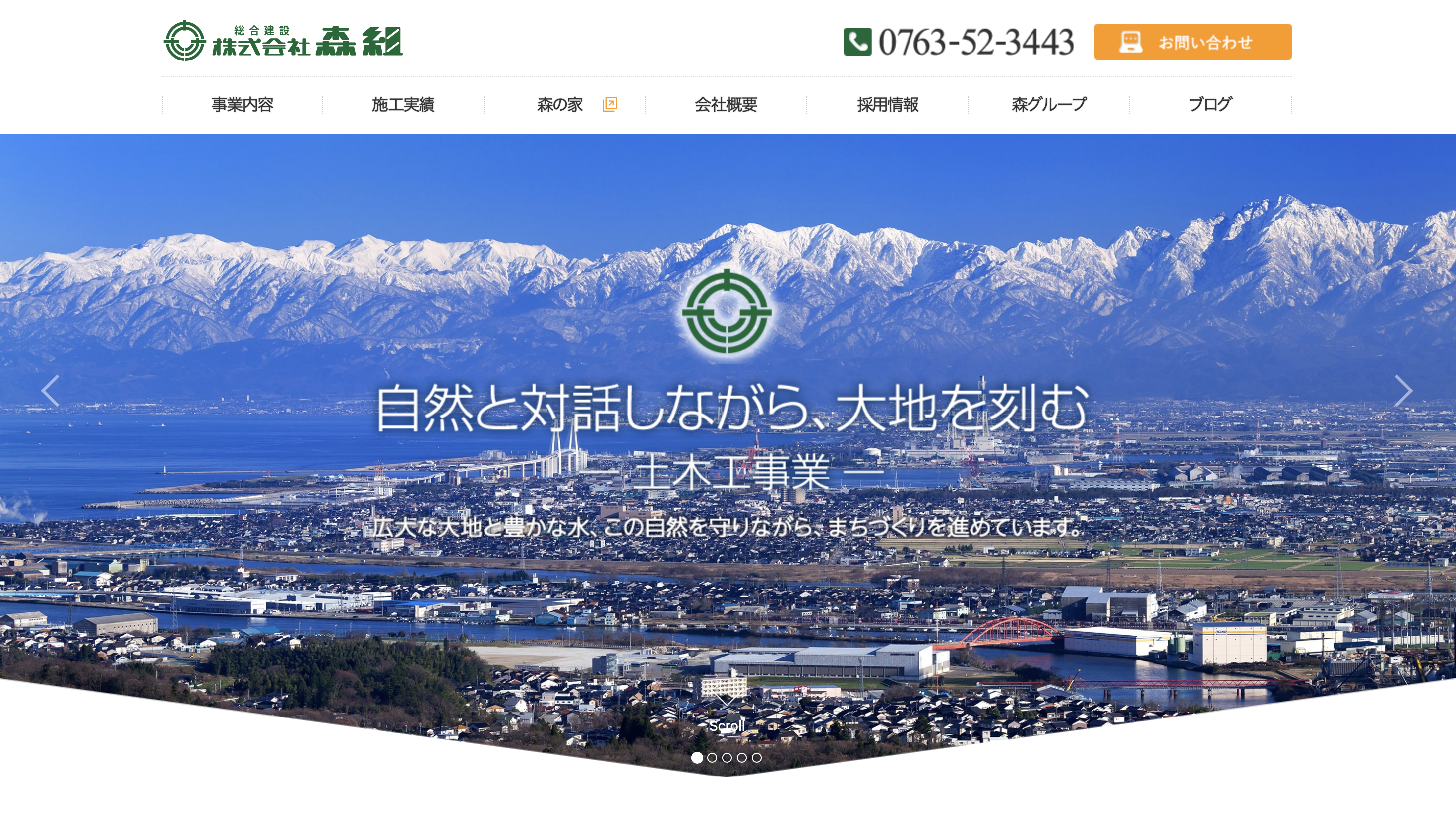 (画像元:森組WEBサイトより)建築工事では、福光駅東口前広場内施設工事、南砺市統合庁舎整備事業建築主体工事などの実績がある。さらに、大工工事業、とび・土工工事業、管工事業などの専門工事業も行なっている。