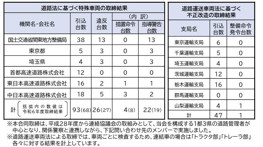 取締を実施した機関別では、国土交通省関東地方整備局が13台、中日本高速道路が5台、東京都が3台、埼玉県が3台、東日本高速道路が2台の違反車両を確認している。