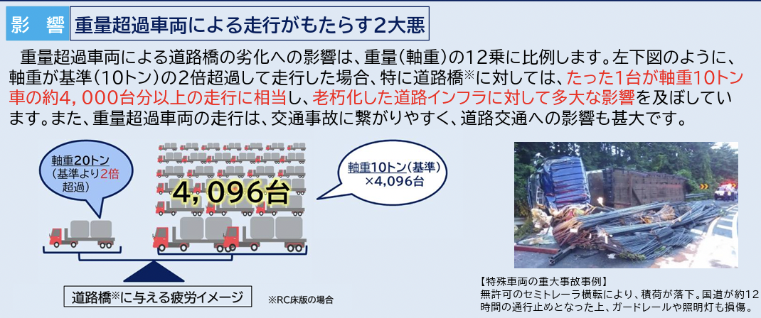 具体的には、軸重が基準の10トンから2倍の20トンに超過した場合、道路橋に対しては軸重10トン車の約4,000台分以上の走行に相当するダメージを与える。