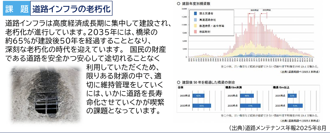 「道路メンテナンス年報2025年8月」によれば、2035年には橋梁の約65%が建設後50年を経過することとなり、深刻な老朽化の時代を迎える。