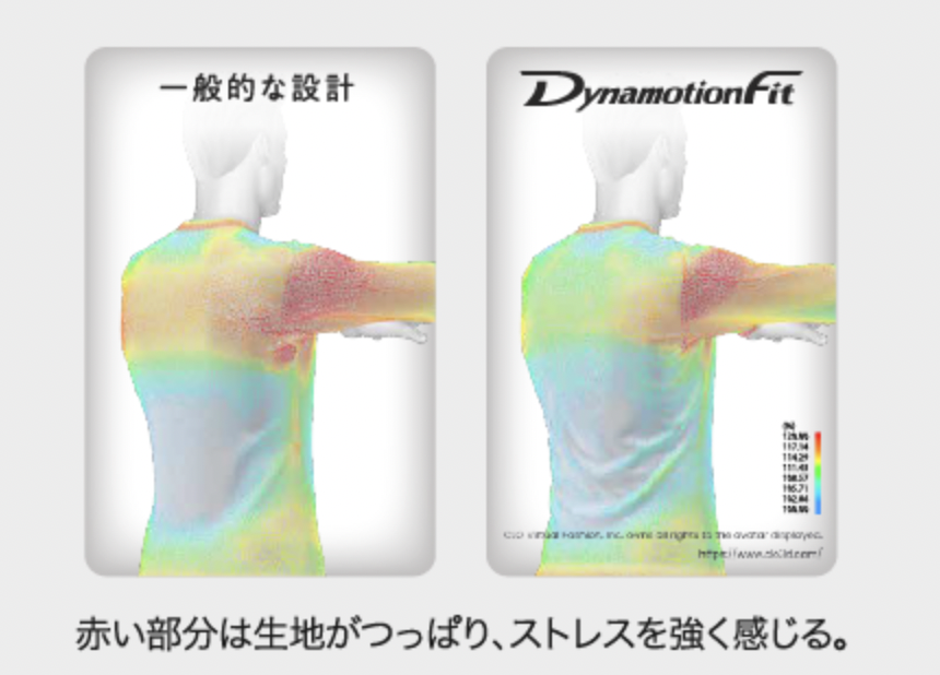 腕の上げ下げや屈伸運動時の皮膚の伸縮を分析し、ウェアのつっぱり感を極限まで抑えている。