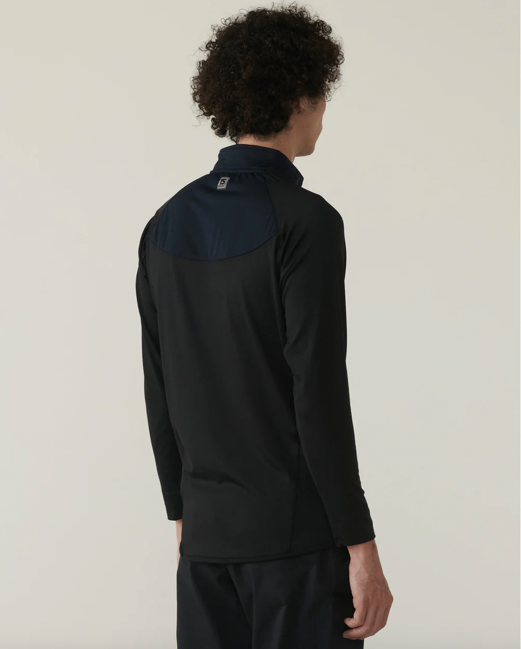 (画像元:ラミネートロングスリーブジップシャツ製品サイトより引用)しかし、全面を防風素材にしてしまうと、今度は汗が逃げずに蒸れて汗冷えしてしまう。そこで、バックパックを背負ったり上着を着たりして汗をかきやすい「背中」や「脇」には、通気性の良いマイクロフリースを配置。