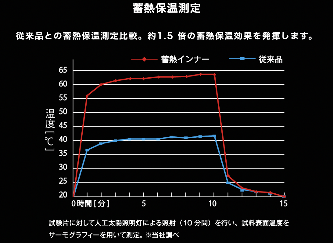 この蓄熱粉末が、人体や太陽光から発せられる熱エネルギー(遠赤外線)を吸収・蓄熱し、生地全体が温まることで体温の低下を防ぐのだ。