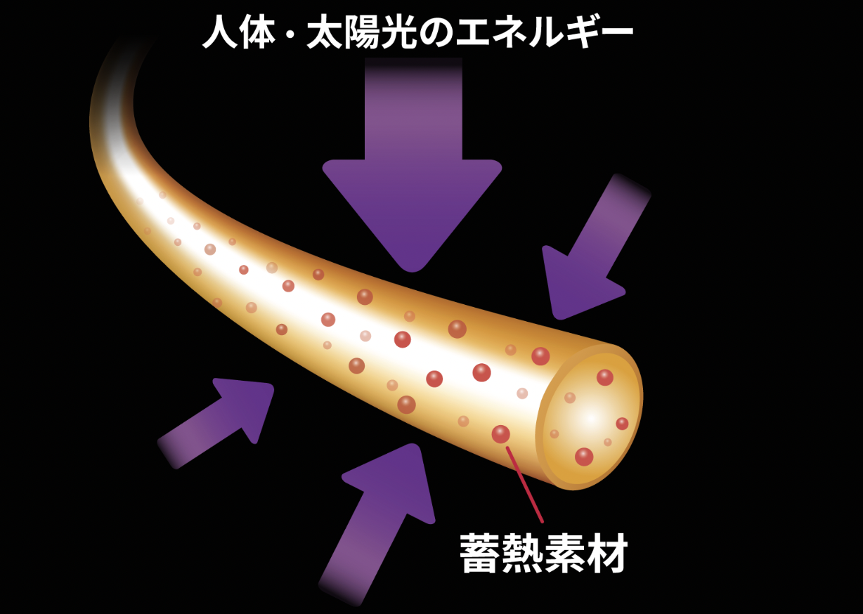 体から常に蒸発している微量な水分(水蒸気)を繊維が吸収する際、水分が液体に変わるときに発生する熱(凝縮熱)を利用して、生地自体を発熱させる仕組みである。