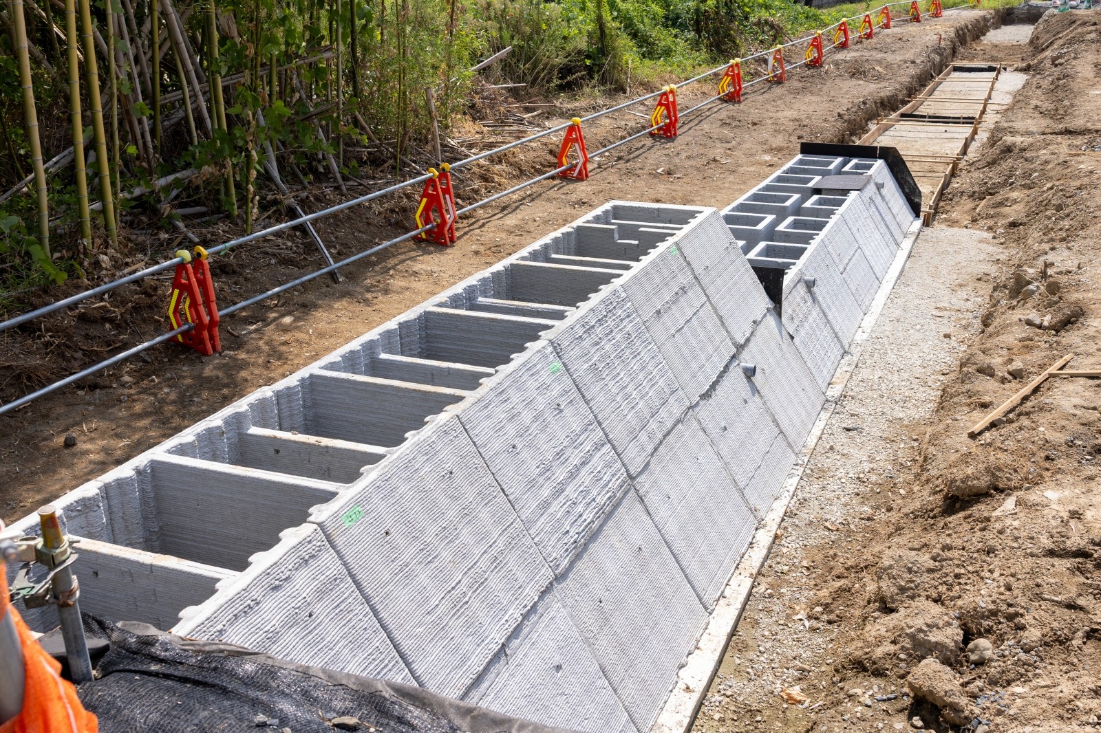運搬と据付の工程すら最小化するこの手法で、「重力式擁壁」を現地で直接印刷するのは日本初の試みである。