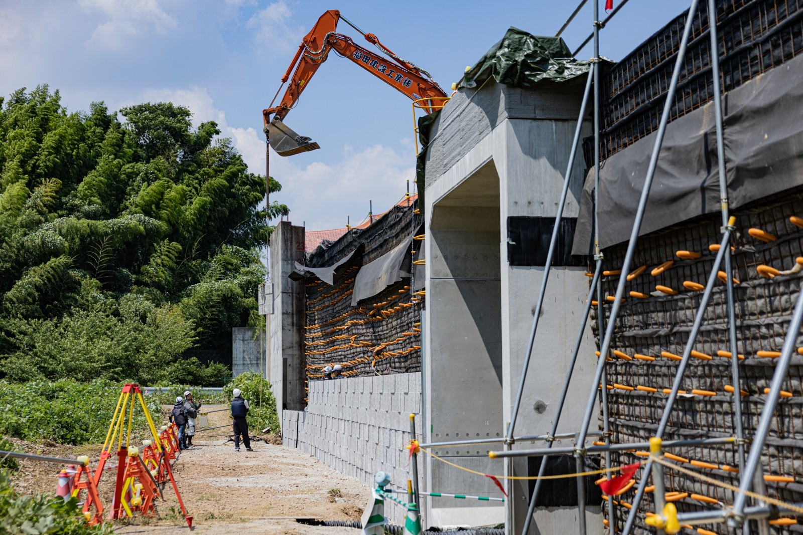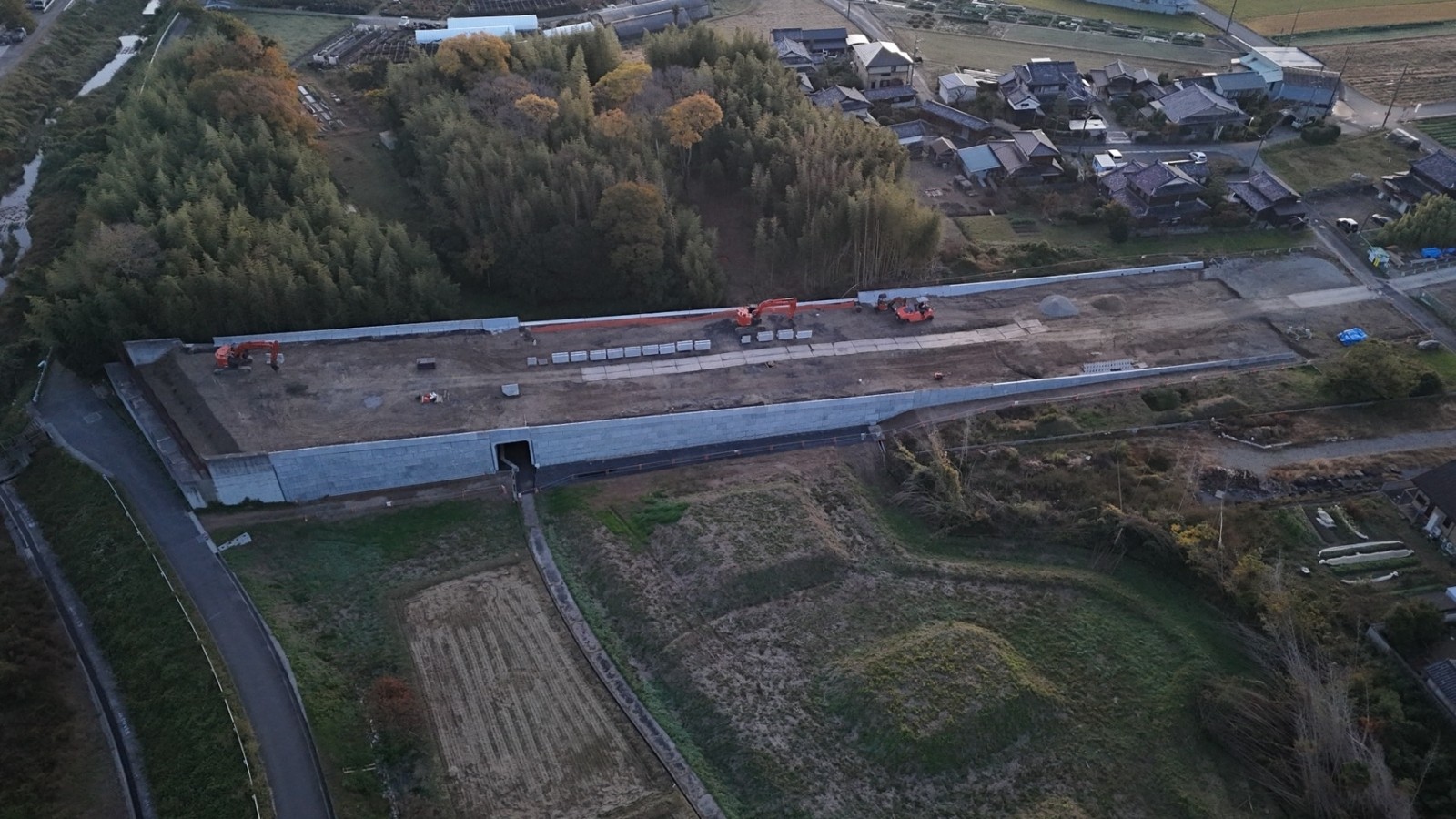 板状の埋設型枠をプリントし、安全な盛土の内側から施工する手法を採用。